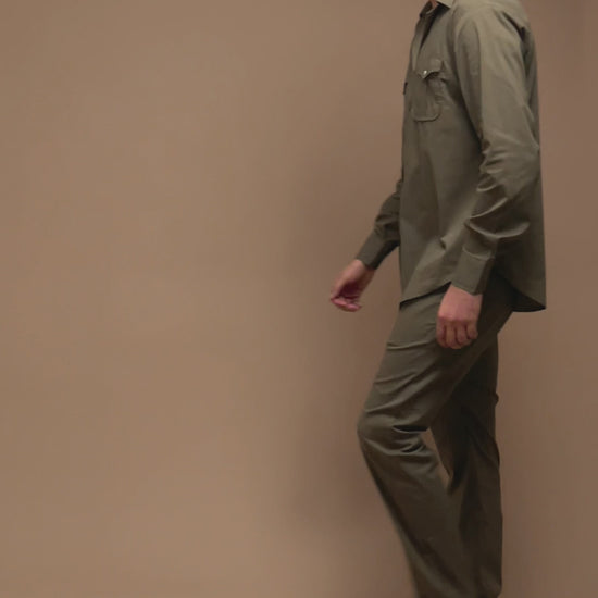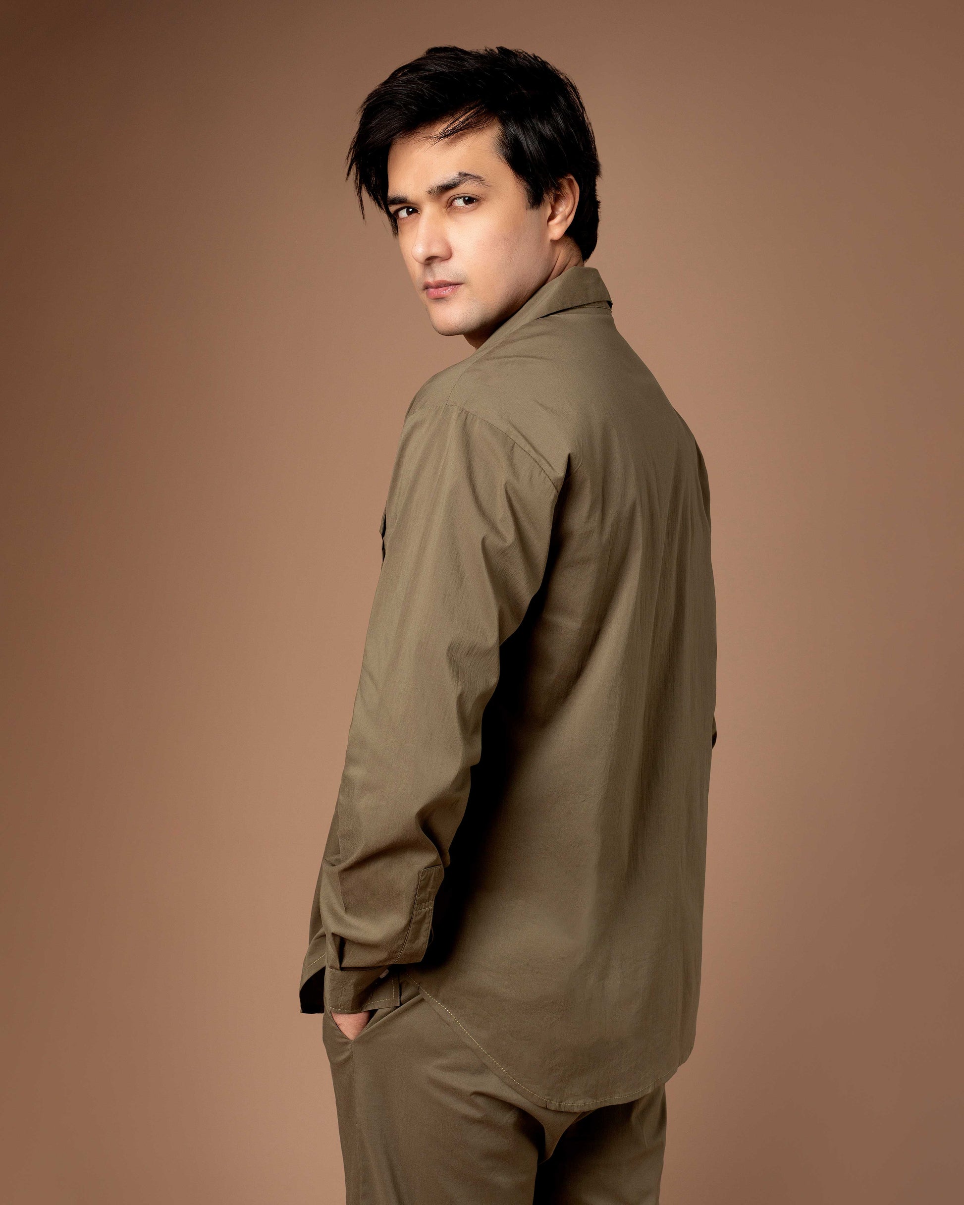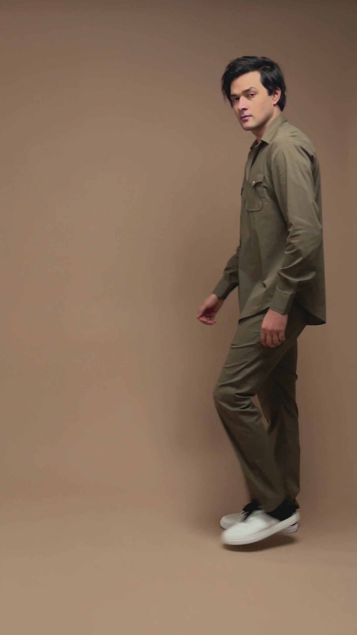 Shirt Design Detail: Cotton button down shirt with collar and double flap pockets at the front. Long sleeves with buttoned cuffs.